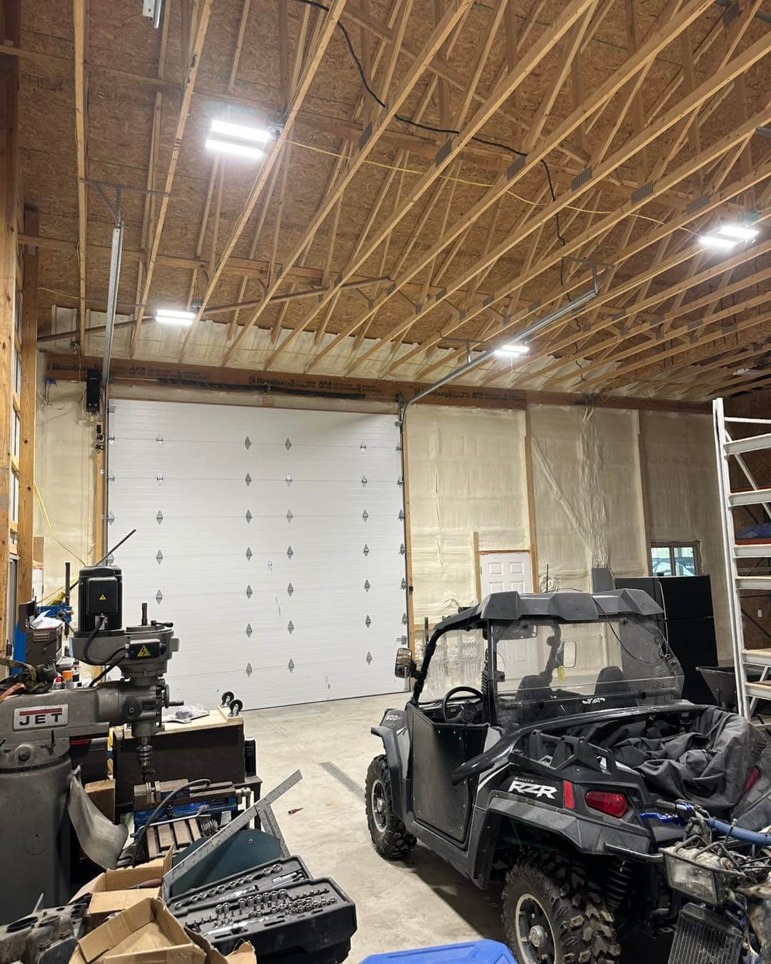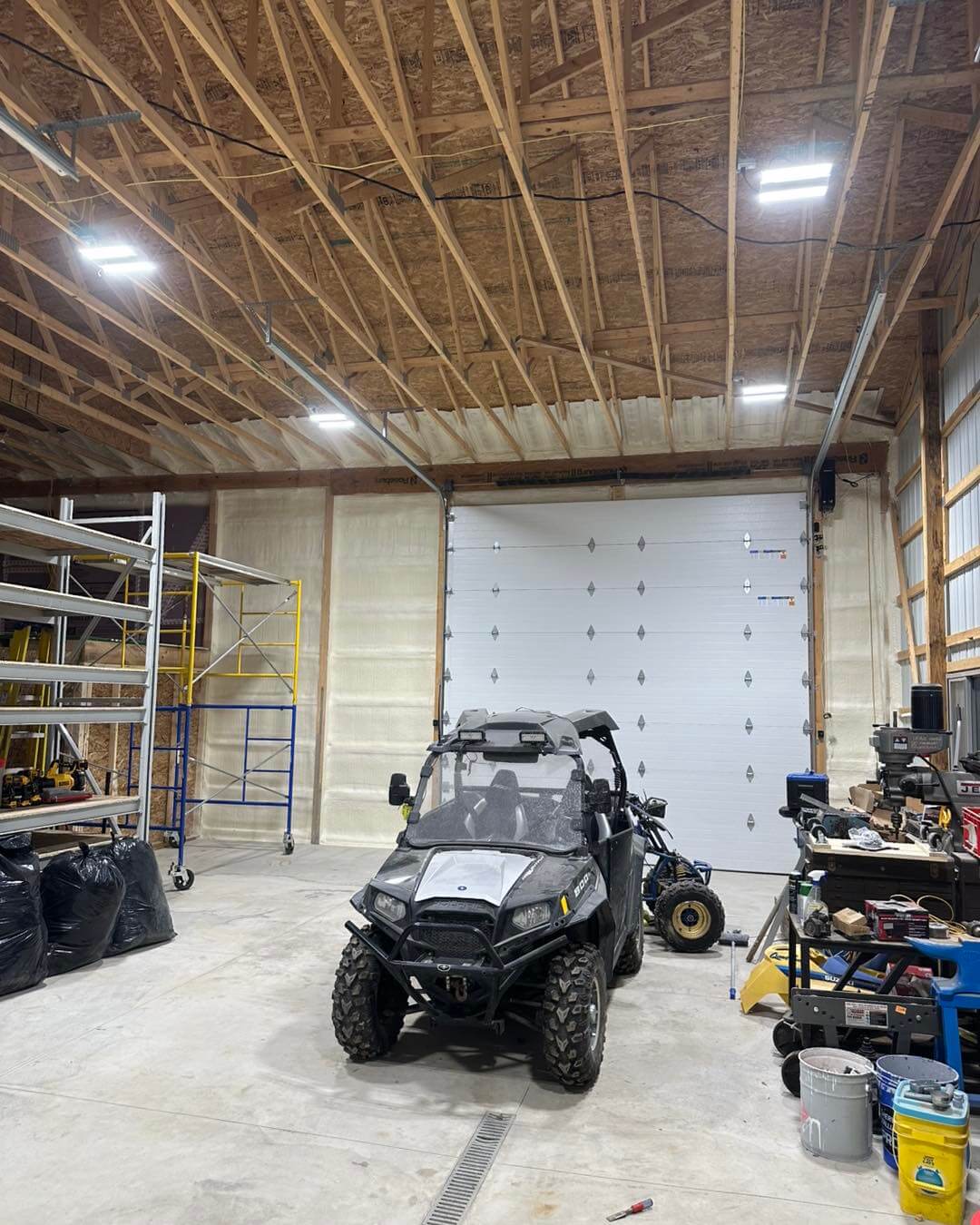 As pole barns often do, this structure had areas at the base of the steel walls and around the concrete floors that allowed daylight to shine through. These gaps would allow drafts to enter the building without spray foam insulation. Firstly, the project was prepped, epoxy was applied to the floor, and plastic was laid out to avoid getting spray foam on the cement floor. Two inches of spray foam was applied to all the walls, leaving enough room to add things as needed. Additionally, this pole barn is set and ready for years of comfortable use; it will remain dry and comfortable.